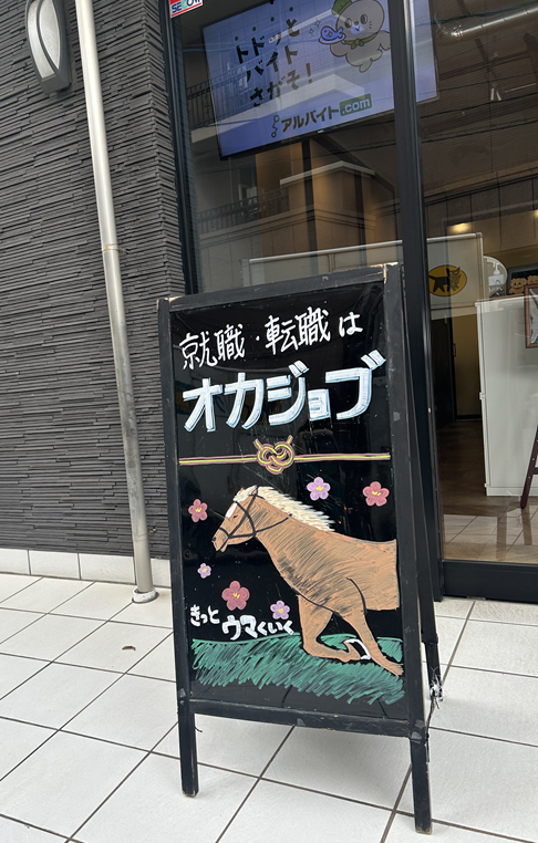 ウェルカムボードには「就職・転職はオカジョブ」というメッセージも添えています。
